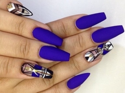 - Не бойтесь экспериментировать с формой. Можно примерить форму ballerina на ноготках и накрасить их матовым ультрамарином. Эффект будет потрясающим!