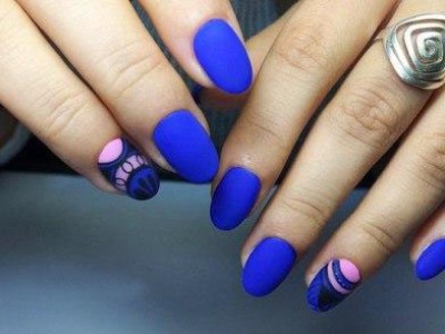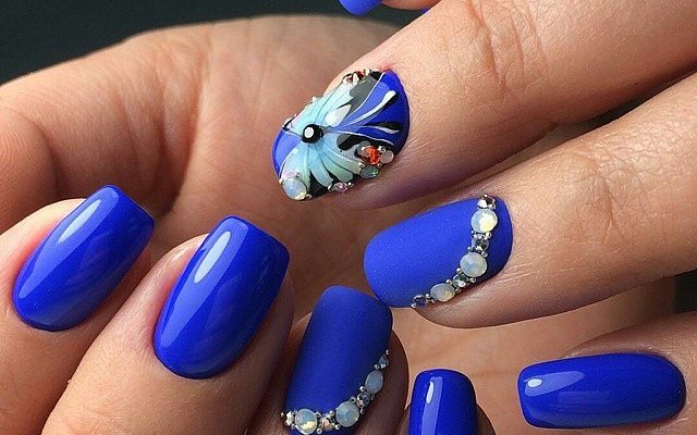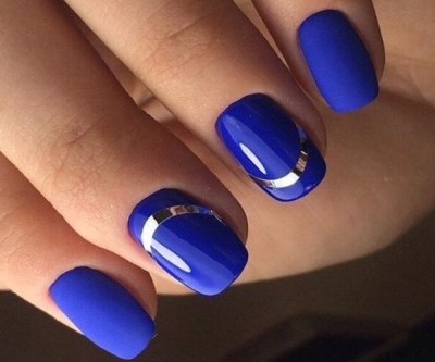 В этом году синий оттенок сам по себе модный и трендовый. Главное придумать интересный дизайн и оформление ногтей. Подчеркнуть глубину синего маникюра можно использовав гель-лак кошачий глаз в комплексе с полупрозрачным витражным покрытием. Для вечернего модного маникюра не грех использовать россыпь страз Swarovski, ведь сейчас как никогда актуальна инкрустация ногтей. Можно поэкспериментировать с различными втирками и найти гармоничное сочетание синего и металлика. Ну и попробовать себя в “модной геометрии”. На данный момент пользуется спросом дизайн с полоской оформленной в виде рисунка, градиента или декорированная стразами и мелким бисером.