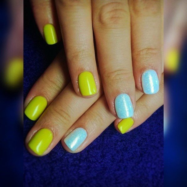 - короткие ногти лучше выглядят в небесном, морозно-голубоватом с серебром исполнении. Допустимы нюдовые и прозрачные покрытия, сочетание с френчем. Замечательно смотрятся солнечно-лимонный и золото;