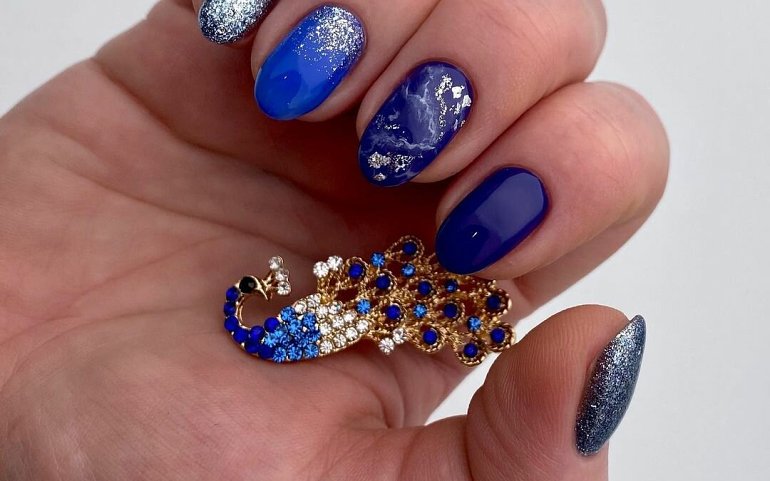 Синий маникюр на разную длину ногтей