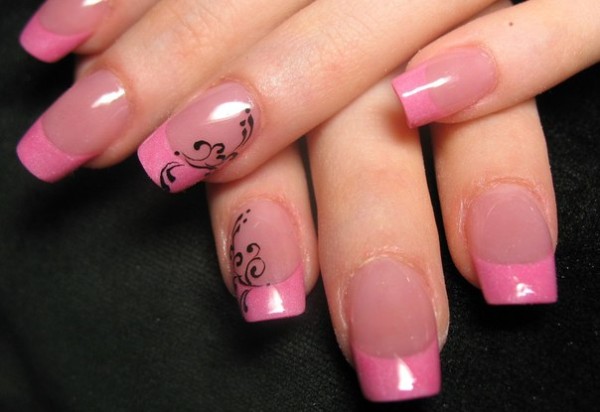 Более спокойный вариант — когда выделен лишь один ноготь. Например, безымянные пальцы можно украсить ярко-розовым глянцевым лаком, а поверх нарисовать черные кляксы.