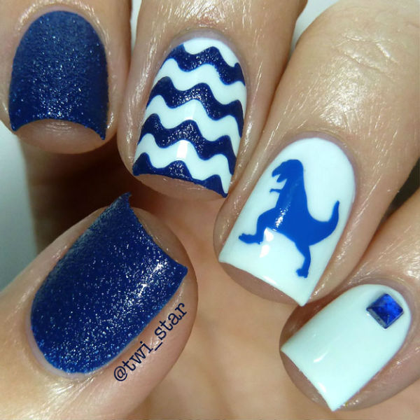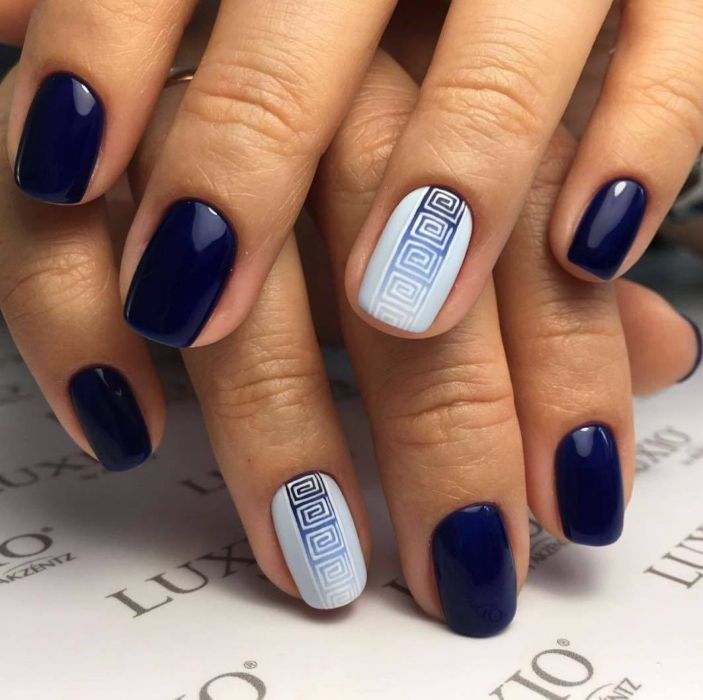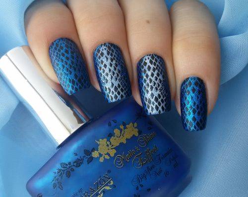 Белый цвет лучше всего сочетается с синим, он прекрасно подходит для создания рисунков и узоров. Вы можете сделать белый маникюр с синими цветами или синие ногти с белыми снежинками – превосходный зимний нейл-арт. Если ваши навыки рисования оставляют желать лучшего, используйте стемпинг – с помощью этого нехитрого приспособления вы сможете отпечатывать на ногтях орнаменты любой сложности. Насыщенные оттенки хорошо подходят для бело-синего маникюра в стиле кракелюр. Для этого нужно специально покрытие, которое трескается после нанесения, создавая живописный эффект облупившейся краски. Синим может быть как сам кракелюр, так и основа, а сверху трескаться будет, например, белый или золотистый оттенок.