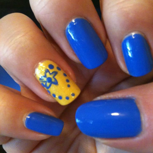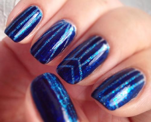 Весьма оригинальным и в тоже время простым вариантом маникюра, является комбинирование темного синего шеллака со светлым на одном ногте. При этом, направление линий, может быть, как вертикальным, так и горизонтальным. Для дополнительного художественного эффекта, линию разграничения двух цветов, можно выделить желтым либо белым цветом.