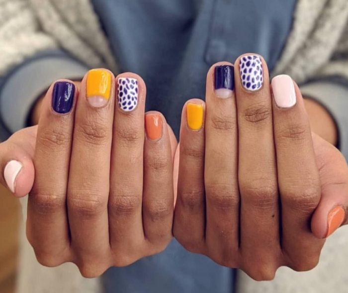 Разноцветный маникюр демонстрирует буйство фантазии дизайнеров нейл-индустрии. Количество вариантов не ограничено. Интересная идея — покрывать различным цветом ногти на каждом пальце.