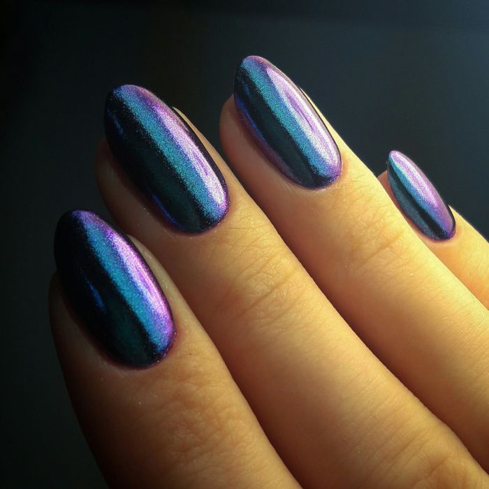 Маникюр с втирками. Благодаря разнообразию втирок создается разный эффект. Выразительно выглядят ногти с отблеском металла. Играют переливами ногтевые пластины с втиркой «северное сияние», «майский жук», « хамелеон». Радужные переливы создает втирка «меланж», «призма».