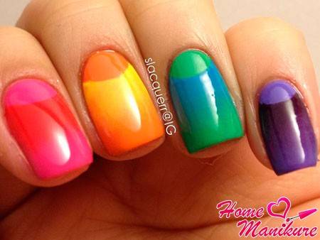 Такой необычный радужный вариант маникюра отлично сочетается с летней пляжной одеждой, и может использоваться на отдыхе.