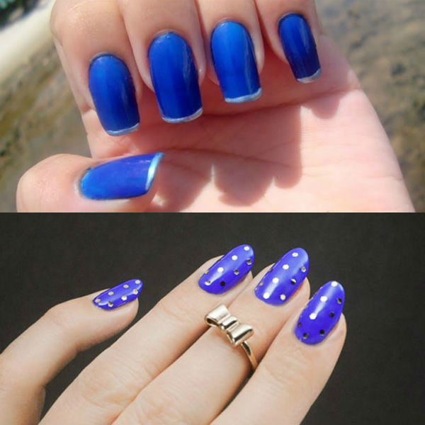 Модный сегодня рамочный дизайн тоже можно использовать – заключите ноготки цвета индиго в желтую или красную рамку. Французский маникюр на коротких ногтях является вариантом такого оформления. Идей синего маникюра великое множество. Можно покрыть ногти сверху блестками или украсить стразами, сделать орнамент при помощь специальной металлизированный ленты или воспользоваться дотсом, чтобы сделать ногти в горошек. Если вы увлекаетесь восточной культурой, можете накрасить пластинки по феншую, выделив один или два пальчика другим цветом или разместив орнамент лишь на одном ноготке правой руки.