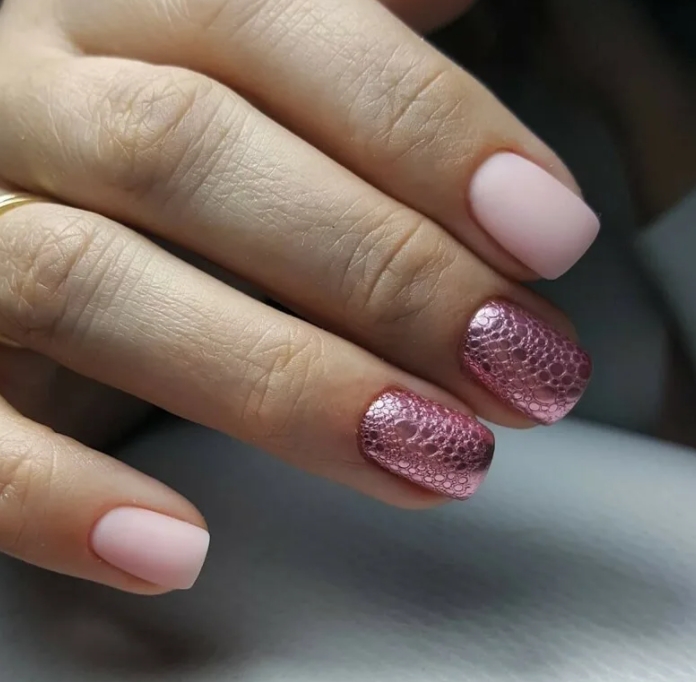 Очень эффектно на них будет выглядеть маникюр в стиле «битое стекло», нанесенный поверх шеллака. Таким образом, можно украсить все ногти или сделать несколько акцентных ноготков.
