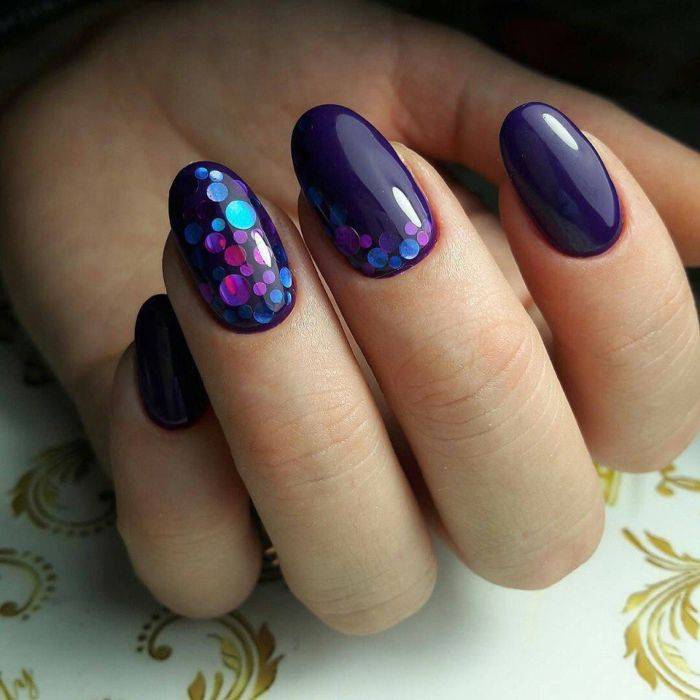 - сверкающий декор рекомендуется располагать на 1-2 пальчиках обеих рук, чтобы не переборщить с вызывающими акцентами. Для этого применяются все современные достижения нейл-индустрии;