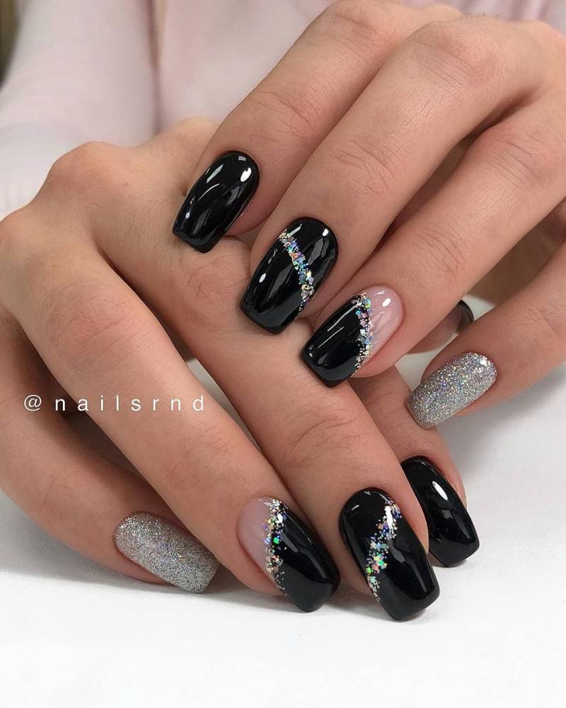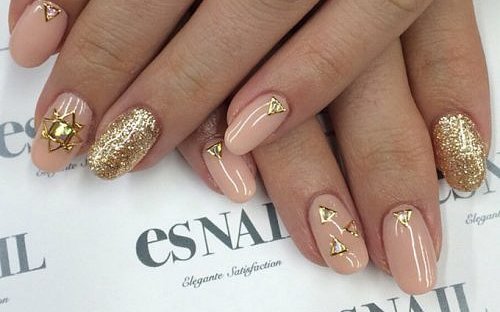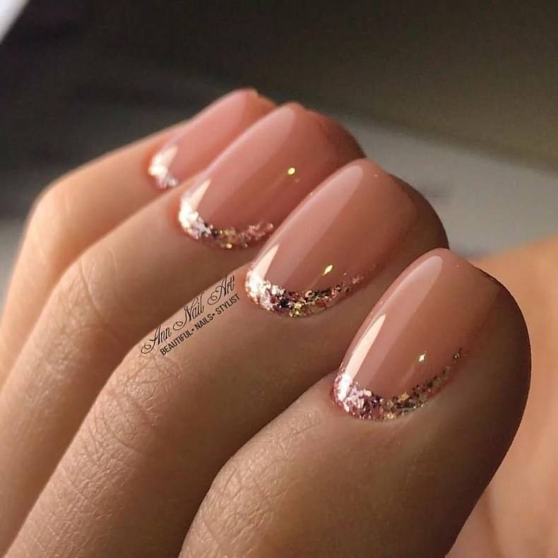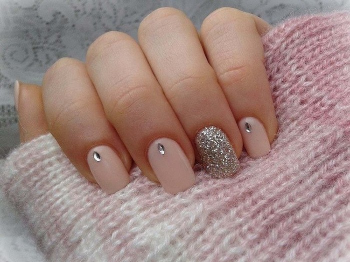 Идеи блестящего маникюра достаточно разнообразны. Но в последнее время модной считается техника, согласно которой безымянные пальчики посыпают декором, а ногти на всех остальных красят одним цветом. Шеллак с блестками допустимо носить на нескольких ногтях, также пыльцу можно использовать для выполнения френча. Нежное покрытие дополняют узором и притрушивают крупицами.