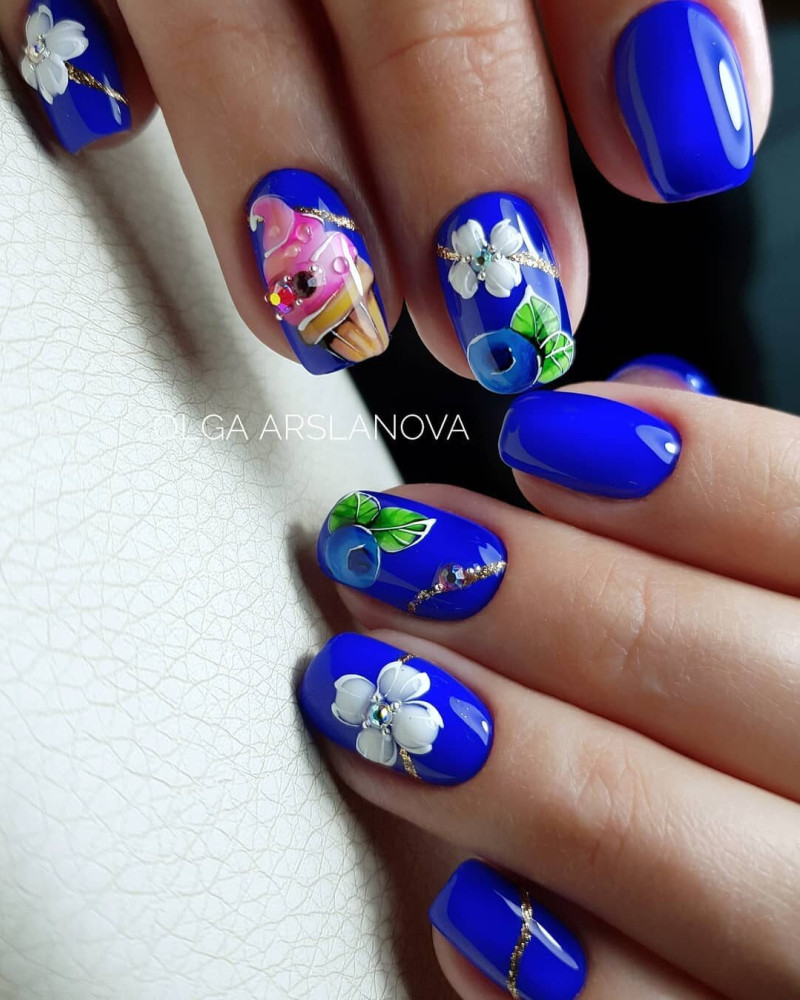 Для получения оригинальной картинки можно покрыть всю площадь мелкими переливающимися стразиками. Не стоит делать такую процедуру на всех пальцах – полученный результат окажется отяжеляющим перебором.
