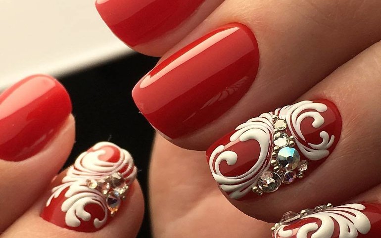 Такое предложение, по мнению нейл-дизайнеров, является беспроигрышным вариантом для создания загадочного и богатого оформления. Бархатное красное покрытие, в любом из оттенков, со стразами, смотрится чрезвычайно элегантно и роскошно. Вам остаётся только покрыть ноготки желаемым тоном и украсить один-два пальчика несложным узором. Разнообразные полосы, аккуратные композиции из украшений разного размера и формы, выделение кристаллами основания либо другой части ногтевой пластины – любой из примеров выглядит волшебно. Также приветствуется сочетание в маникюре глянца и матового топа. Это могут быть как отдельно покрытые разными структурами ноготки, так и модный дуэт на одном ногтевом ложе. Границу между ними можно украсить бусинами или мелкими кристаллами.
