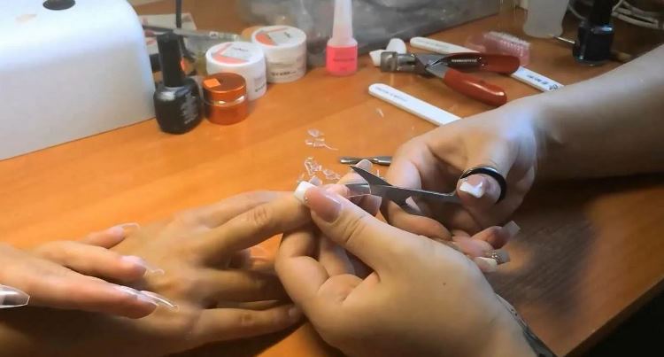Нижние формы предварительно вырезаются под форму пальца с помощью ножниц. Подготовленные формы крепят на палец и распределяют на них материал. После высыхания в лампе формы снимаются и наносится дополнительный слой геля.