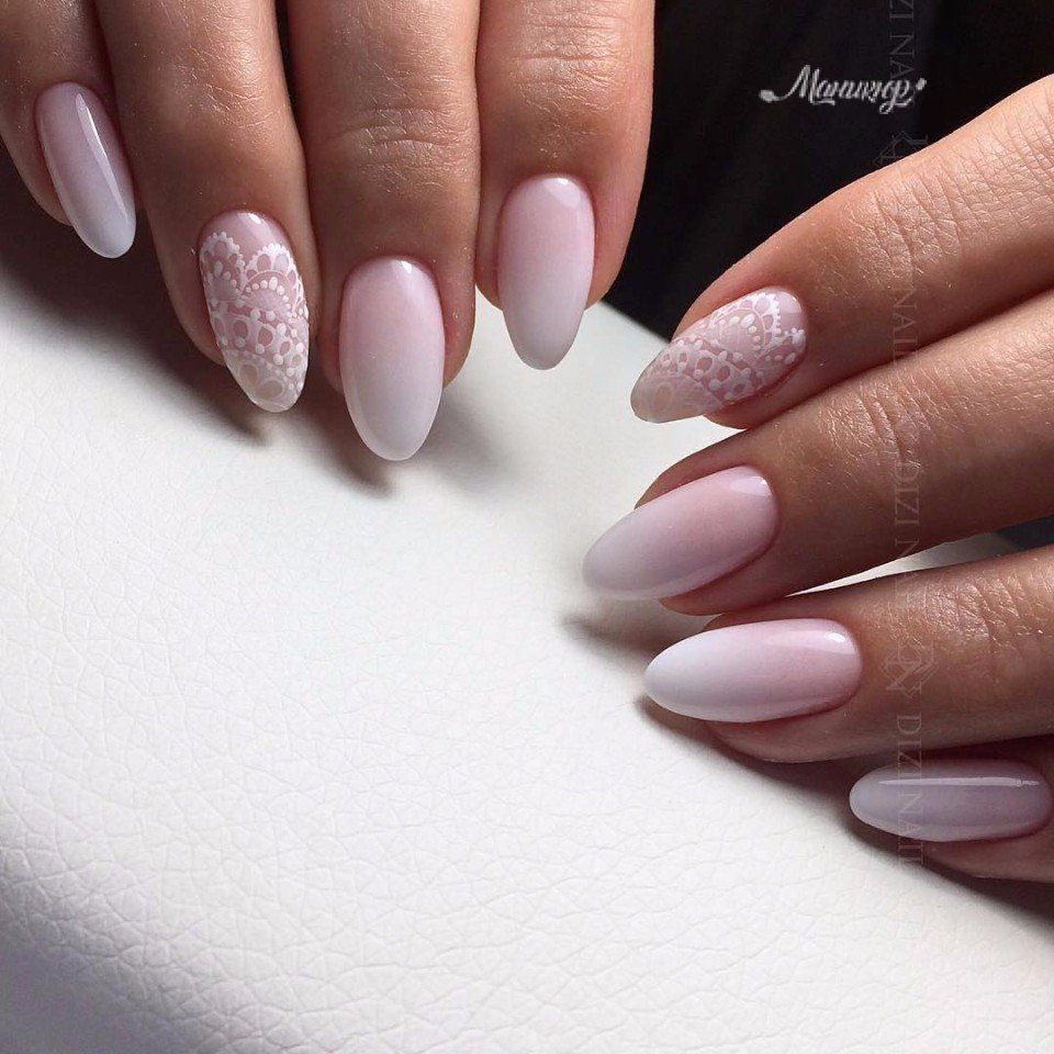 светло-розовых ногтя. Первый ноготь имеет белый базовый лак с тонкими