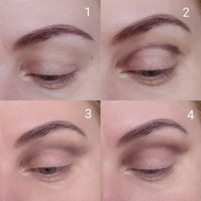 Выбираем светлый оттенок из палитры, можно с серым или жёлтым подтоном. Широкой мягкой кистью наносим тени на подвижное и неподвижное веко, при этом аккуратно растушёвывая для мягкого перехода в натуральный тон кожи.