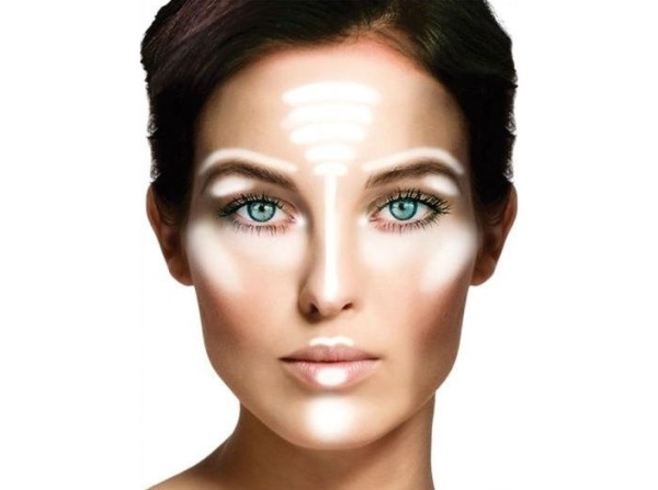 Процедура контурирования лица с помощью хайлайтера предполагает нанесение косметического средства на скулы, центральную часть лба, спинку носа, зоны под бровями, ямочку над губой или подбородок – области применения напрямую зависят от визуальных особенностей вашей внешности. Некоторые девушки предпочитают подчеркнуть изящность своих скул, а другие делают акцент на взгляде, контурно выделяя участки возле бровей.