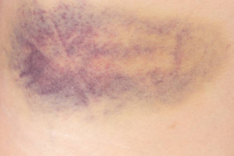 Мелкие кровоподтеки часто расположены в районе пальцев рук, крупные кровоизлияния, как правило, располагаются на ногах (бедра, голени).