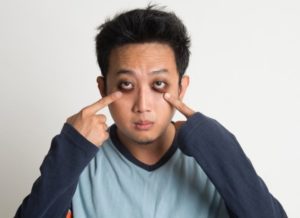 - После хронических недосыпаний. Происходит этого из-за того, что глазные двигательные и мимические мышцы век не расслабляются должным образом, нарушается кровообращение, лимфатическая жидкость застаивается. Это приводит к ухудшению метаболизма клеток. Сроки болезненного недосыпания разные – у одного человека патологические отеки, синева образуются спустя 2 дня, другому можно спать 3 часа в сутки неделю, только потом появятся темные круги и складки на веках.