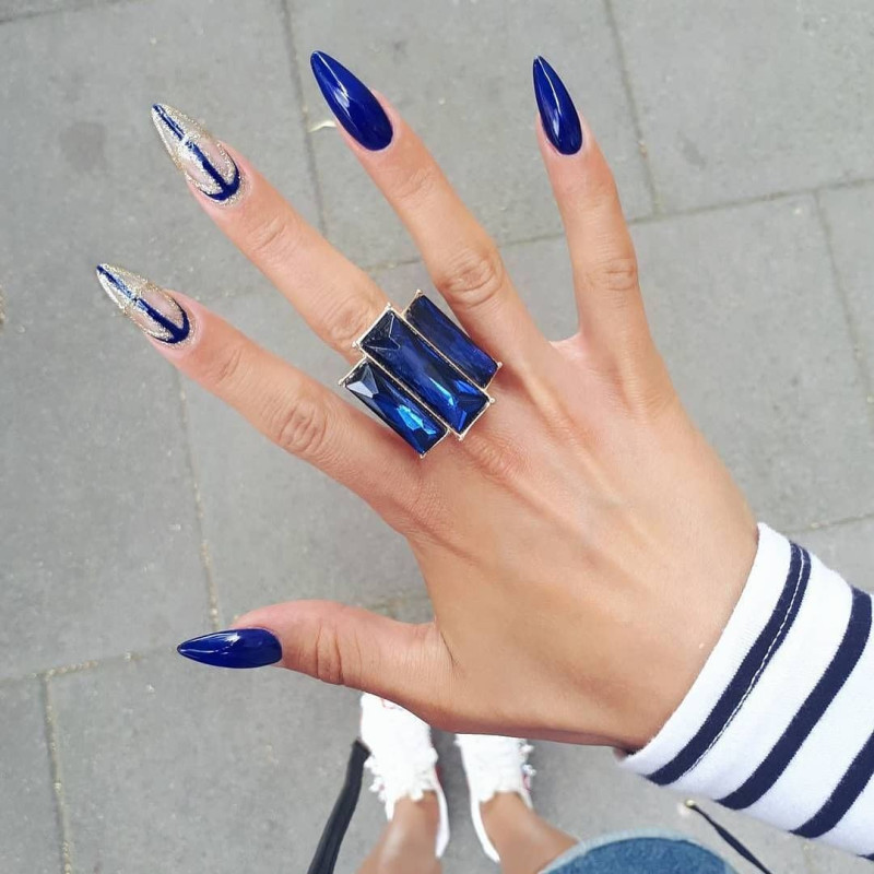 Почему бы не сделать нейл-арт ярче, смешав 2 модные тенденции – синий и мягкий овал?