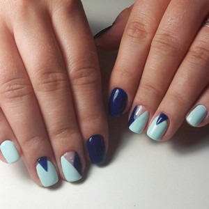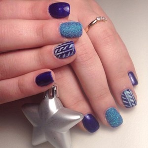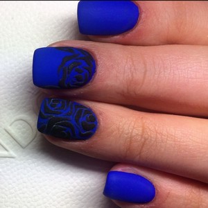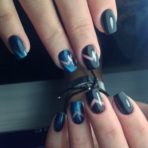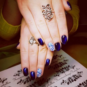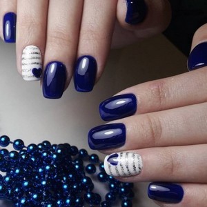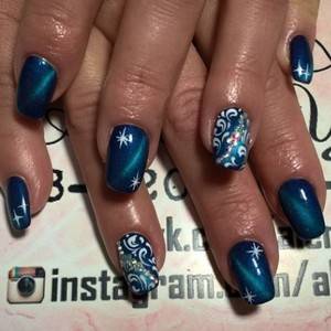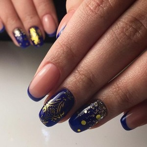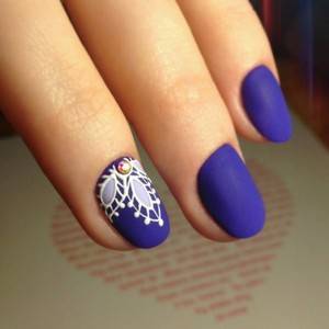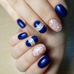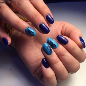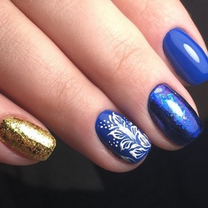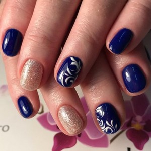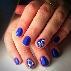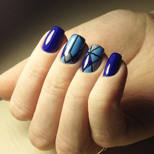 Если женщине сложно самой сделать привлекательный маникюр, ей лучше прибегнуть к помощи опытного специалиста. Если уж хочется самой все сделать, тогда можно на синем фоне нарисовать витиеватые узоры и геометрические фигурки.