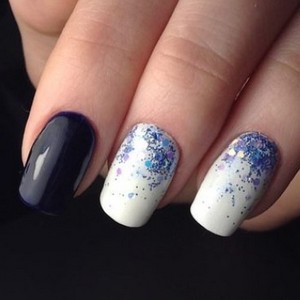 На коротких ногтях синий маникюр, как и любой другой яркий цвет, смотрится всегда интересно. Синий цвет можно сочетать с другими оттенками. Например, с белым. Разбавить однотонный дизайн поможет вертикальный градиент из основных цветов.