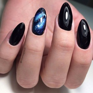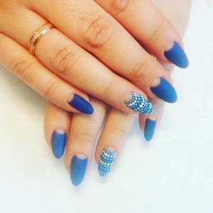Ногти миндальной формы с синим покрытием любого оттенка всегда выглядят стильно и эффектно. Они могут быть дополнены различными элементами дизайна, украшены тематическими рисунками. Главное, чтобы декора на ногтях не было чересчур много.