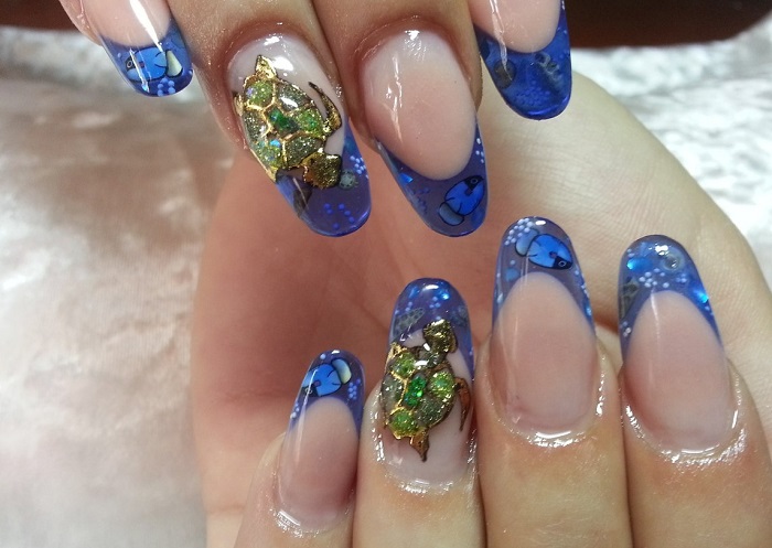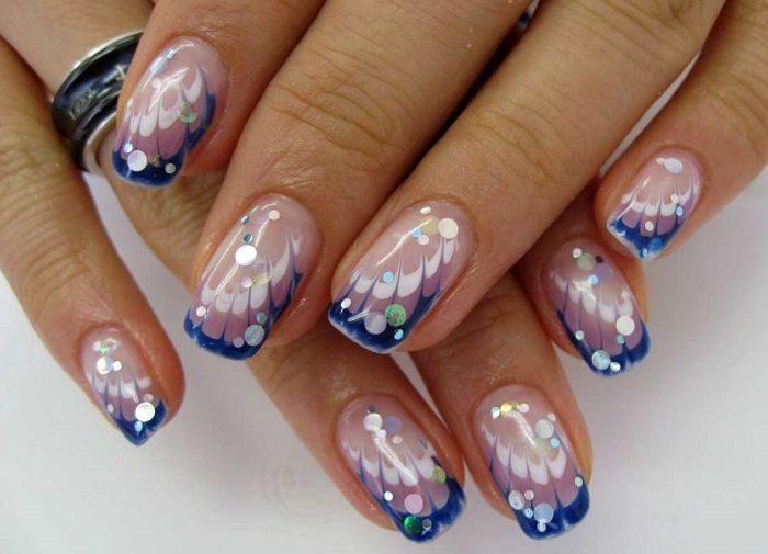 Синий цвет ассоциируется с морскими глубинами, бескрайним небом над водной гладью. Синий френч может быть в морском духе, если кончик ногтя представляет собой волну, для этого внутренняя линия изображается в волнистом варианте, а на остальном ногте нарисованы чайки. Или же водные мотивы изображаются на одном-двух ногтях. Это могут быть сине-белые полосы тельняшки, рисунки якоря, штурвала, морских обитателей. Декор в виде жемчуга, ракушек.
