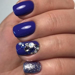 На длинных ногтях особенно красиво смотрится дизайн в синем цвете, где присутствует глиттер или цветные камни. Декор из страз разных размеров любой маникюр делает роскошным. Камни могут украшать только один ноготь, а могут декорировать все пальцы.