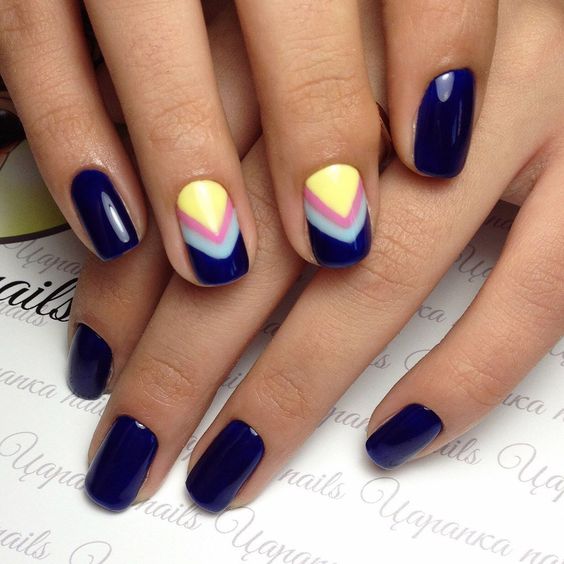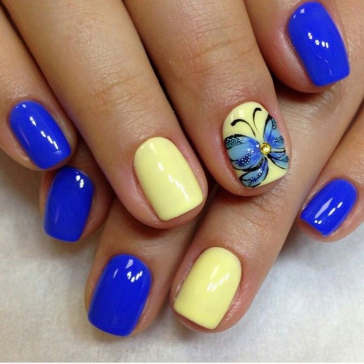 Прекрасно смотрятся вместе насыщенные темные тона синего с желтым. Такой фон можно украсить геометрическими фигурами и красивыми узорами. Это сочетание хорошо подходит для создания лунного маникюра.