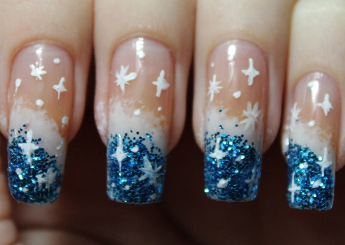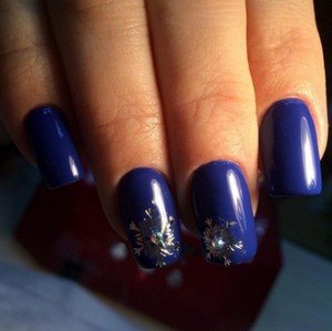 - для маникюра в зимний период целесообразно изобразить снежинки на поверхности ногтя, покрытой лаком синего цвета;
