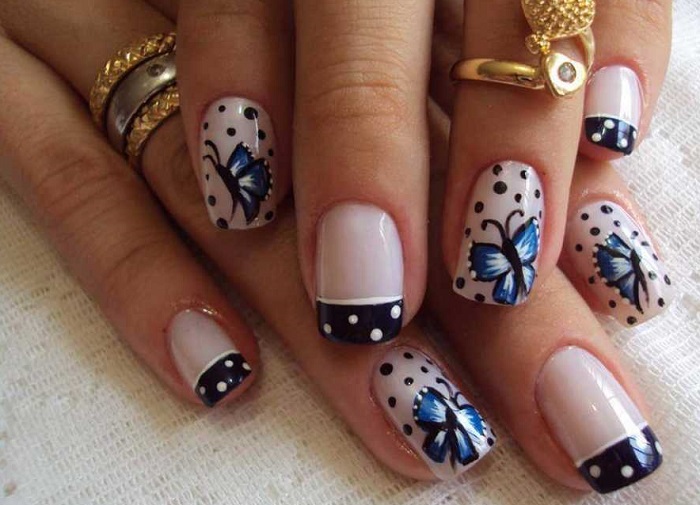 Цветы или бабочки – отличная идея для пляжного или просто летнего маникюра. Россыпь нежных ромашек или роскошная красная роза с золотом, белоснежные цветы, украшенные стразами или яркие крылья бабочек прекрасно гармонируют с синим френчем.