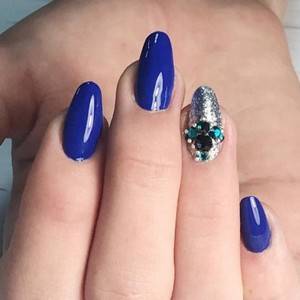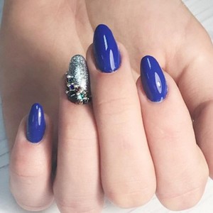 Классическим вариантом оформления ногтей миндальной формы является однотонное покрытие. Миндальные ногти отлично раскрывают весь потенциал синего цвета. На ногтях такой формы он смотрится особенно выразительно. Сразу становится видна вся глубина оттенка. Если хочется разбавить дизайн, сверху можно нанести немного блесток.
