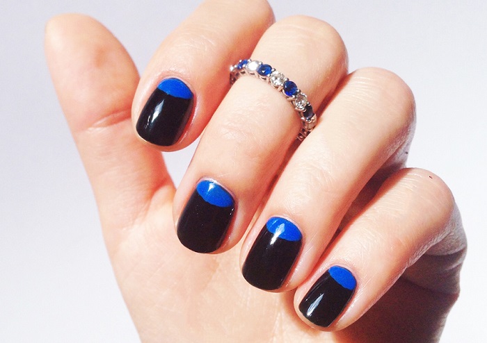 Сочетать темно синие полоски на ногтях стоит с прозрачной базой, которая полностью покрывает ногтевую пластинку. Неплохой вариант для эксперимента – это темно синий френч в обратном исполнении. «Лунки» выигрышно смотрятся на ухоженных ногтях, поэтому кутикула должна быть в безупречном состоянии при выборе данного дизайна среди прочих.