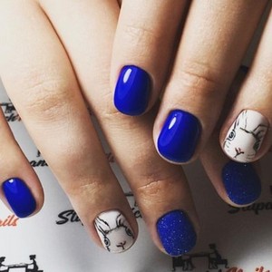 Можно дополнить френч рисунками в морском или зимнем стиле, синие оттенки прекрасно для этого подходят. Норвежские олени или парусник на фоне морских волн – это свежо и романтично.
