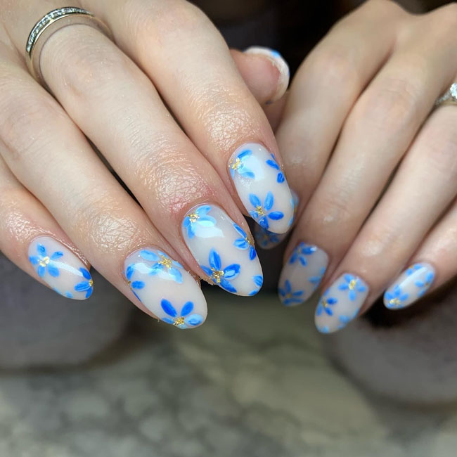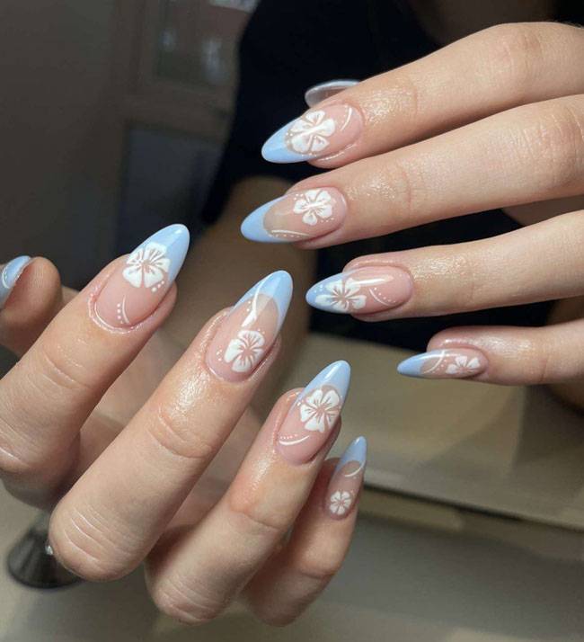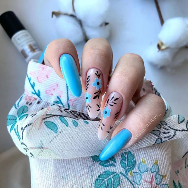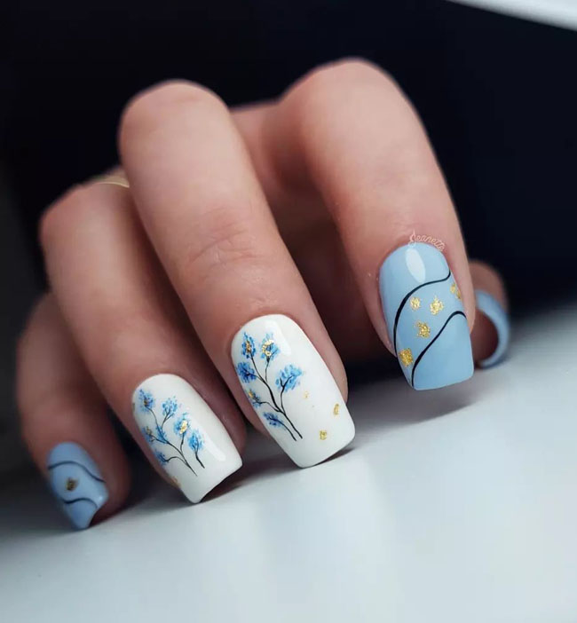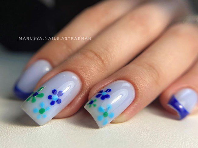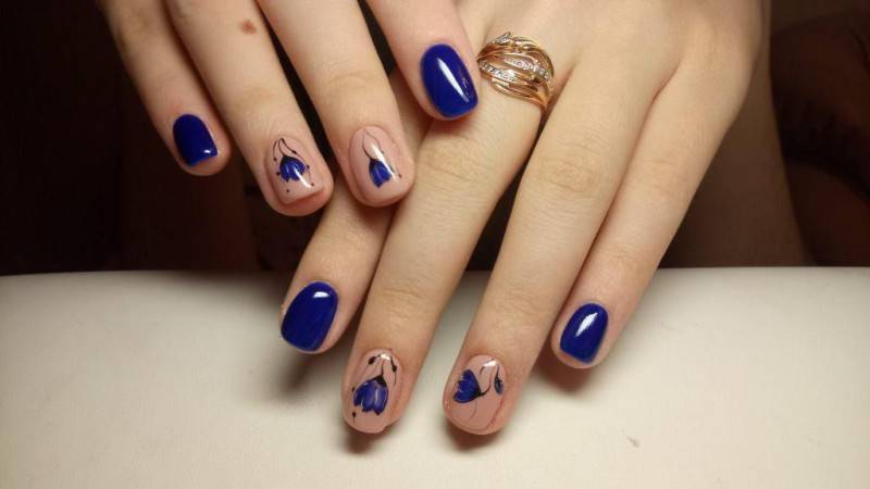 - Весной рекомендуется бежевый маникюр с красивыми синими цветами.