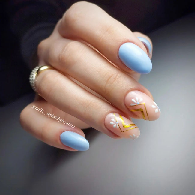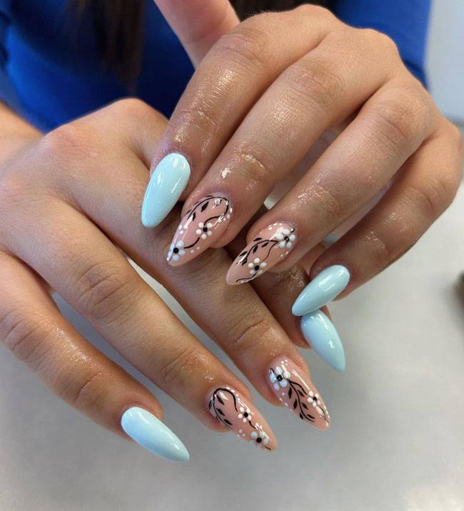 Для весеннего и летнего маникюра используйте нежные оттенки голубого, мягкие тона лазурного. Путь ноготки выглядят свежо и сочно.