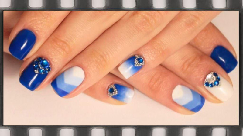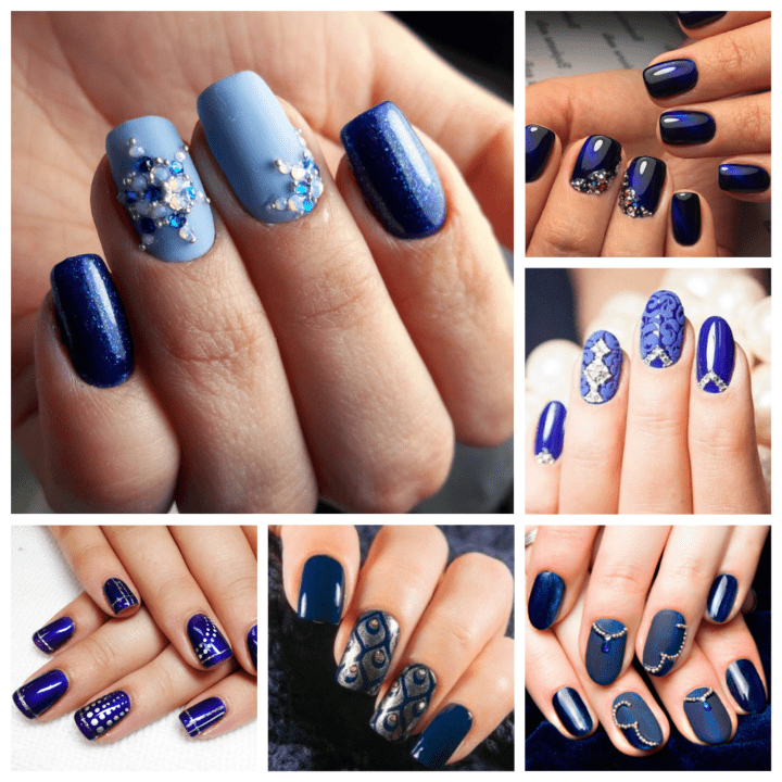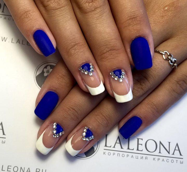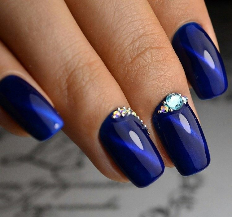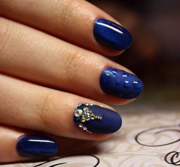 Если на синие ногти добавить инкрустацию стразами получим модный вечерний маникюр. Рекомендуются вариации с различного вида втирками, «модной геометрией».