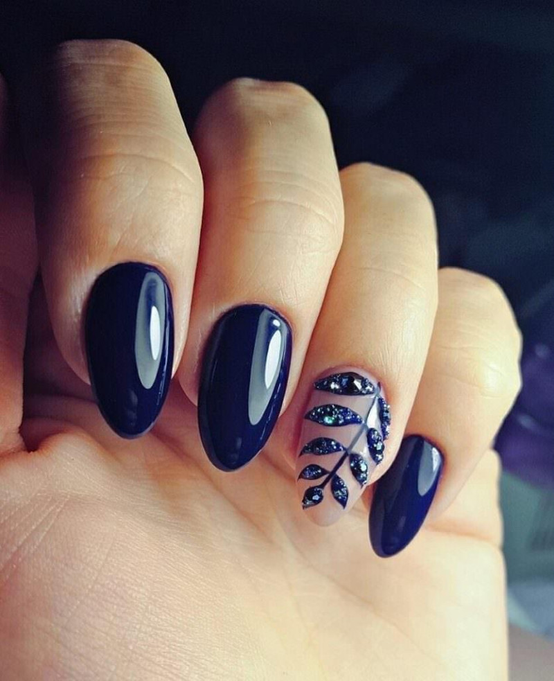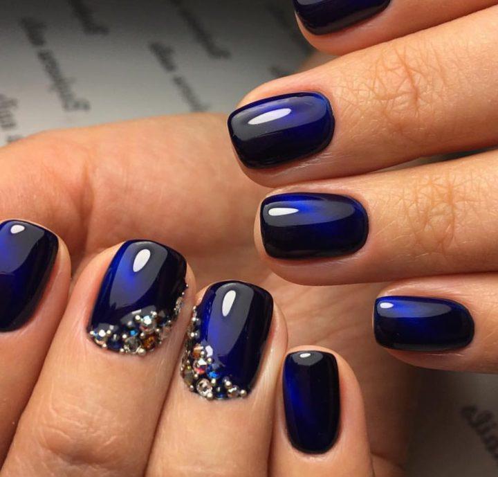 Темно-синий маникюр с легкими бликами блесток придает всему образу четкости, выразительности завершенности. Такой оттенок подойдет к любому наряду, так как может стать альтернативой черному. Декор из стразов создаст праздничное настроение. Можно сделать его минимальным, украсив камнями только один ноготь, или декорировать два средних пальца, сделав маникюр по фен-шуй.