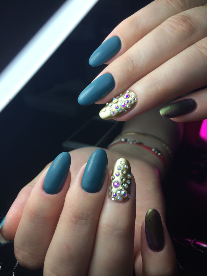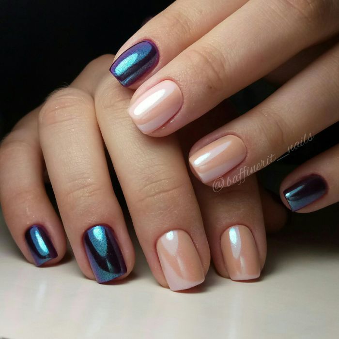 Матовый синий маникюр с дизайном втиркой. Полюбившаяся мастерам зеркальная втирка в оттенках золото, серебро или радуга позволяет преобразить фоновый цвет и сделать дизайн нарядным. Для создания эффекта кошачий глаз можно использовать магнитную втирку.
