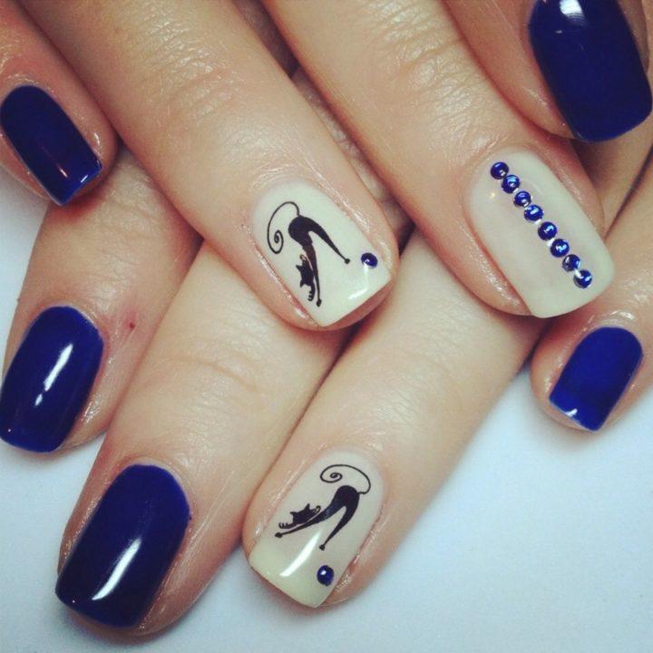 Самое удачно сочетание для тех, кто ищет универсальный дизайн — черно-синий маникюр с декором или без него.