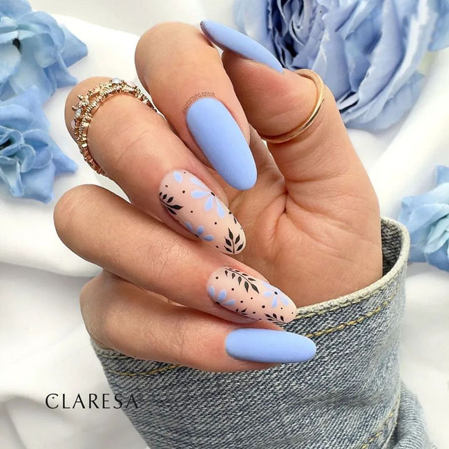 Немного разнообразить синий матовый маникюр на коротких ногтях поможет дизайн – это может быть растительный принт или даже анимализм.