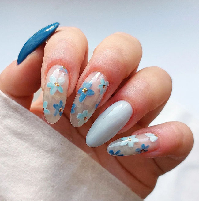 Популярный синий маникюр 2021 — оформление с разводами. Чтобы создать такой нейл-дизайн на палитре поставь 2-3 капли разных оттенков синего и аккуратно смешай между собой, чтобы получили разводы. Затем набирай понемногу и переноси на ноготь. Кстати, лучше всего переносить узор на непросушенный топ – линии будут лучше растекаться и в итоге дадут красивый рисунок.