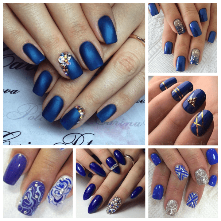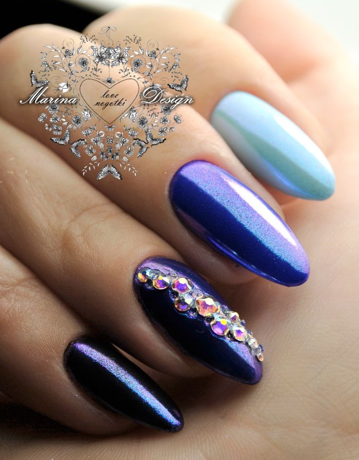 Можно поэкспериментировать с различными втирками и найти гармоничное сочетание синего и металлика. Ну и попробовать себя в “модной геометрии”. На данный момент пользуется спросом дизайн с полоской оформленной в виде рисунка, градиента или декорированная стразами и мелким бисером.