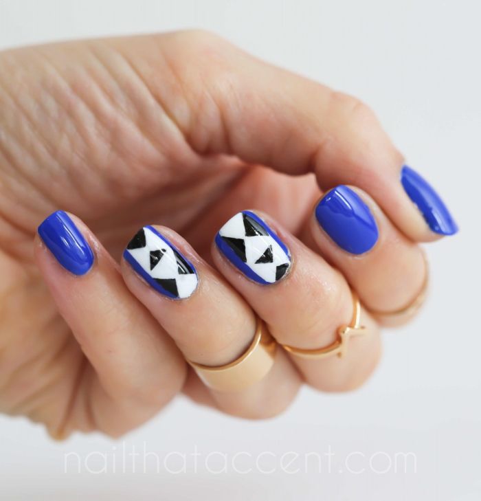 Стильных красок в дизайн поможет добавить геометрия. Необычные фигурки разного размера и формы смотрятся очень современно и модно в сочетании с синим гель-лаком. Пересечение ромбов, квадратов и прямых линий создает уникальный кубистический дизайн. Вы будете неотразимы с таким оформлением ногтей.