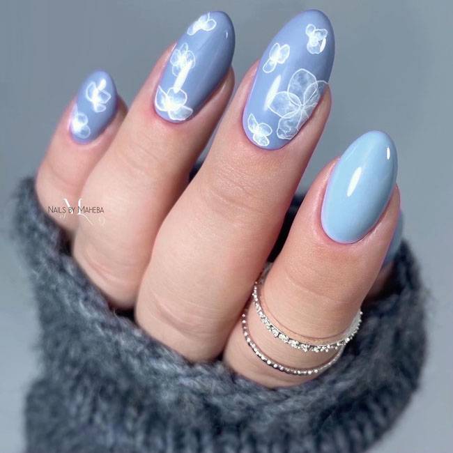 Голубой цвет в маникюре, а также в одежде, интерьере, окружающей природе всегда освежает, освещает дополнительным небесным светом, придает легкость, подчеркивает естественность, глубину, неимоверную привлекательность и природную красоту.
