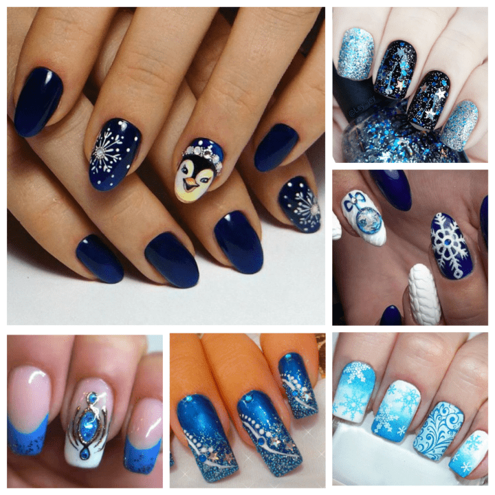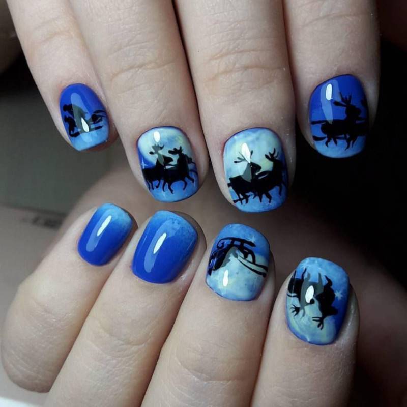 Зимой синий маникюр выглядит особо актуально. Можно также создавать новогодний дизайн, нанося на ногти изображение снежинок, снеговиков, елочек и тд. Зимой можно более свободно добавлять в декор красный и бордовый лаки. Это будет смотреться очень гармонично.
