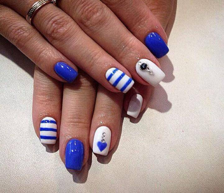 Маникюр в синих тонах – это, конечно, морская тематика. Ни один летний сезон не проходит без морских каникул. Настроение создаст графический полосатый маникюр в стиле «тельняшка». Белый, синий и золото – просто, лаконично и нарядно. Забери идею для летнего отпуска. Подбери тематический декор – якорь, рыбки, морские звезды, жемчуг и кораблики.