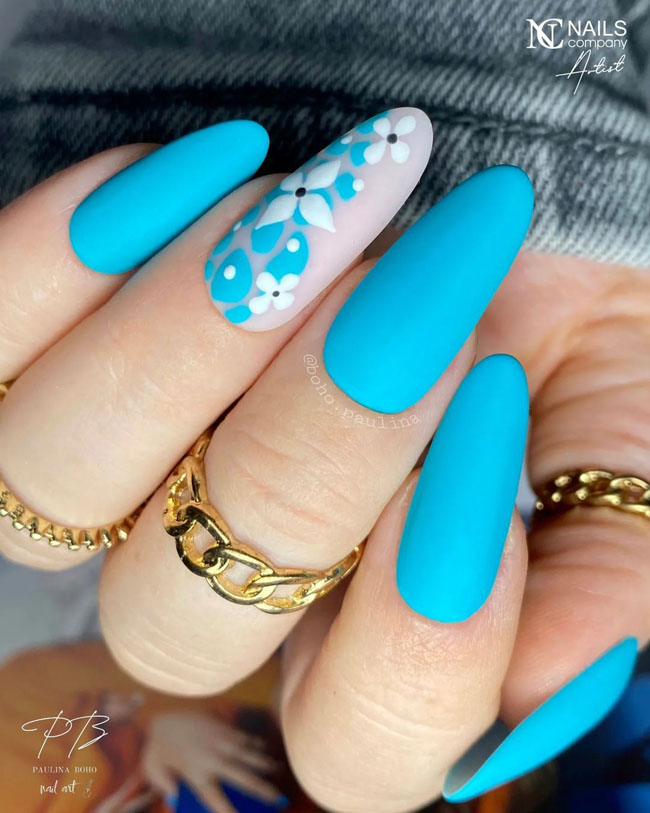 Тем, кто не любит яркий дизайн, отлично подойдет однотонный синий маникюр. Форма и длина ногтей не имеют значения, здесь уже все зависит от ваших предпочтений. Для более элегантного вида можно покрыть ногти матовым топом. Маникюр приобретет более нежный и женственный вид.
