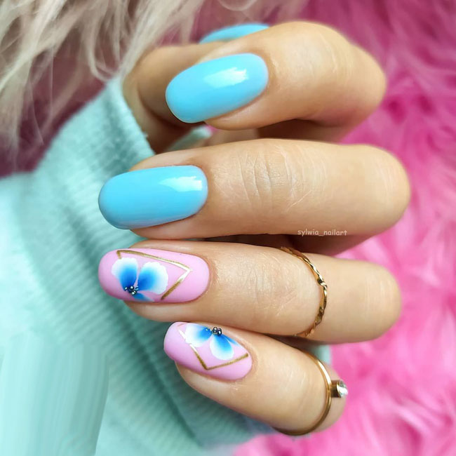 - Летом синему маникюру рекомендуются оттенки розового или желтого.