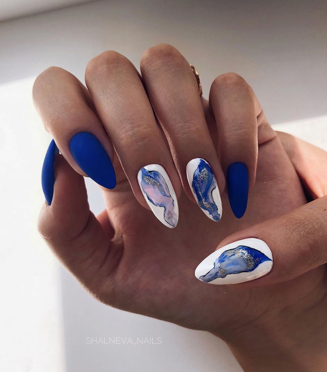 Популярный синий маникюр 2021 — оформление с разводами. Чтобы создать такой нейл-дизайн на палитре поставь 2-3 капли разных оттенков синего и аккуратно смешай между собой, чтобы получили разводы. Затем набирай понемногу и переноси на ноготь. Кстати, лучше всего переносить узор на непросушенный топ – линии будут лучше растекаться и в итоге дадут красивый рисунок.